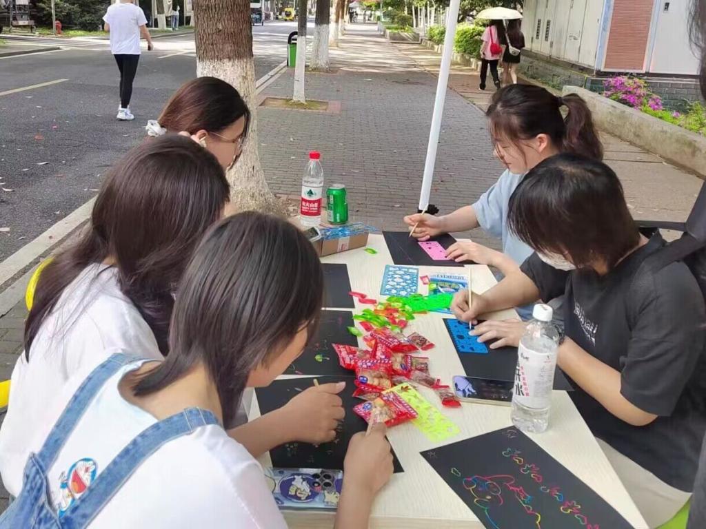 本次摆台活动以刮画纸为主,吸引众多学生参与。刮画纸活动让学生们画出心中的春日景色,分享自身所感受到的春天。此次活动开拓学生的思维,培养学生的动手能力,使学生学在其中,更乐在其中。