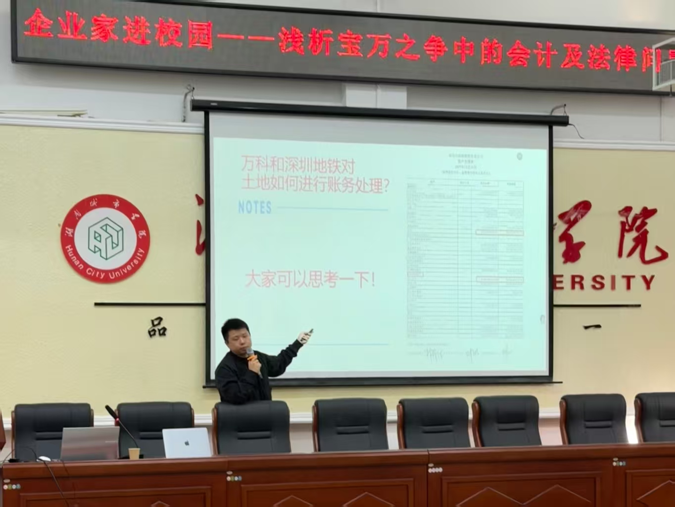 吴冕先生结合自身丰富的从业经验,围绕“宝万之争”这一中国资本市场经典案例,深入剖析了其中涉及的会计处理、融资结构、公司治理及法律合规等核心问题。他详细解读了宝能系通过资管计划、保险资金等高杠杆工具收购万科股权的操作路径,分析了其中存在的信披合规、表决权合法性及资金链风险等争议点,引导学生从财务与法律双重视角理解企业并购与资本运作的复杂性。讲座中,吴冕还结合个人职业发展路径,分享了从证券公司到产业基金、从深圳回到湖南的成长经历,强调了扎实的专业知识、平台资源积累与持续学习的重要性。他鼓励同学们“在大学阶段尽量通过ACCA前9门课程”,并善用实习机会,积累实战经验,为未来职业发展打下坚实基础。