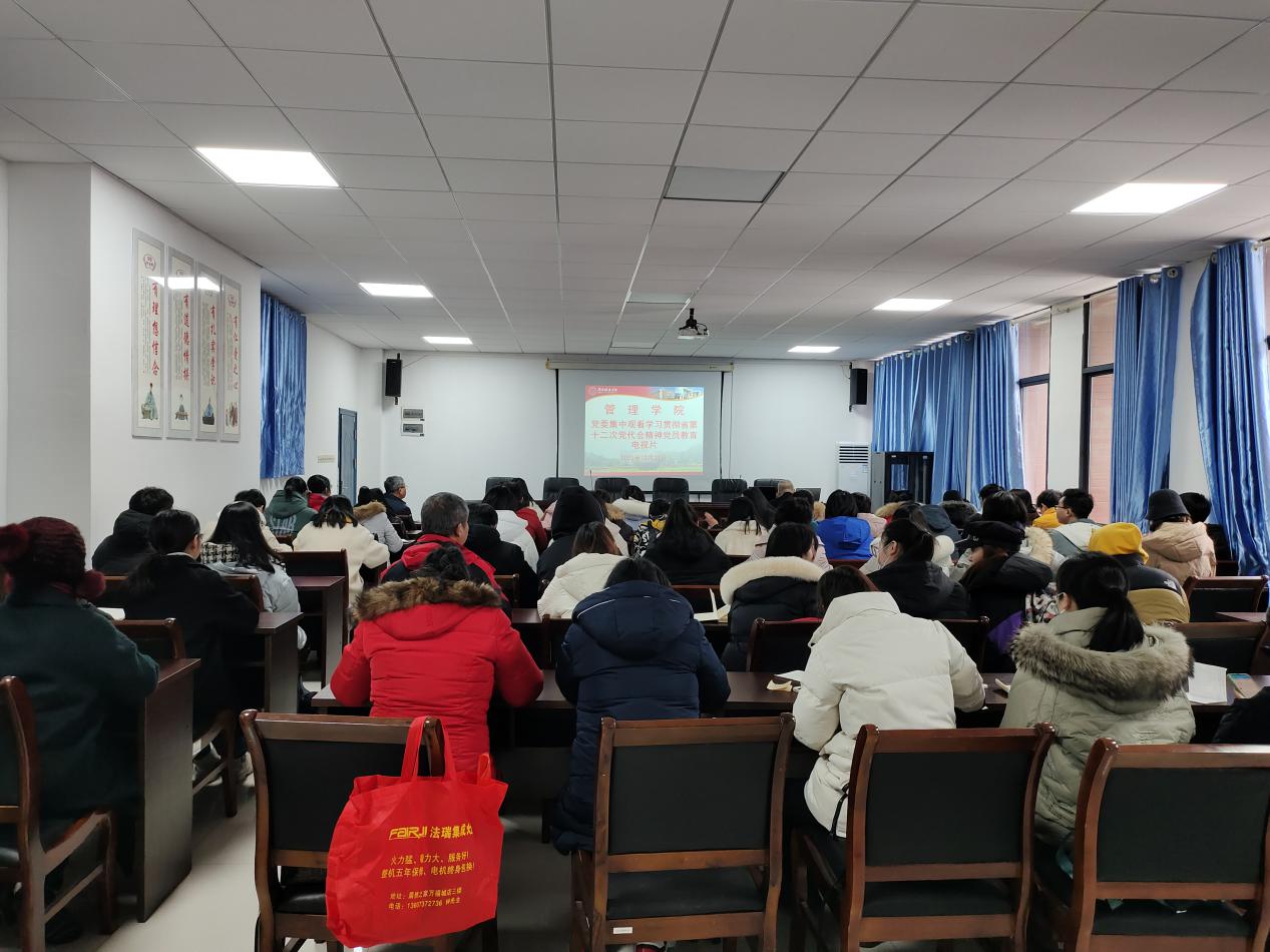 12月27日上午9点管理学院全体党员在管理楼504集中学习《奋进新征程 谱写新篇章——深入学习宣传贯彻省第十二次党代会精神》党员教育电视片,学习后开展了学习讨论。