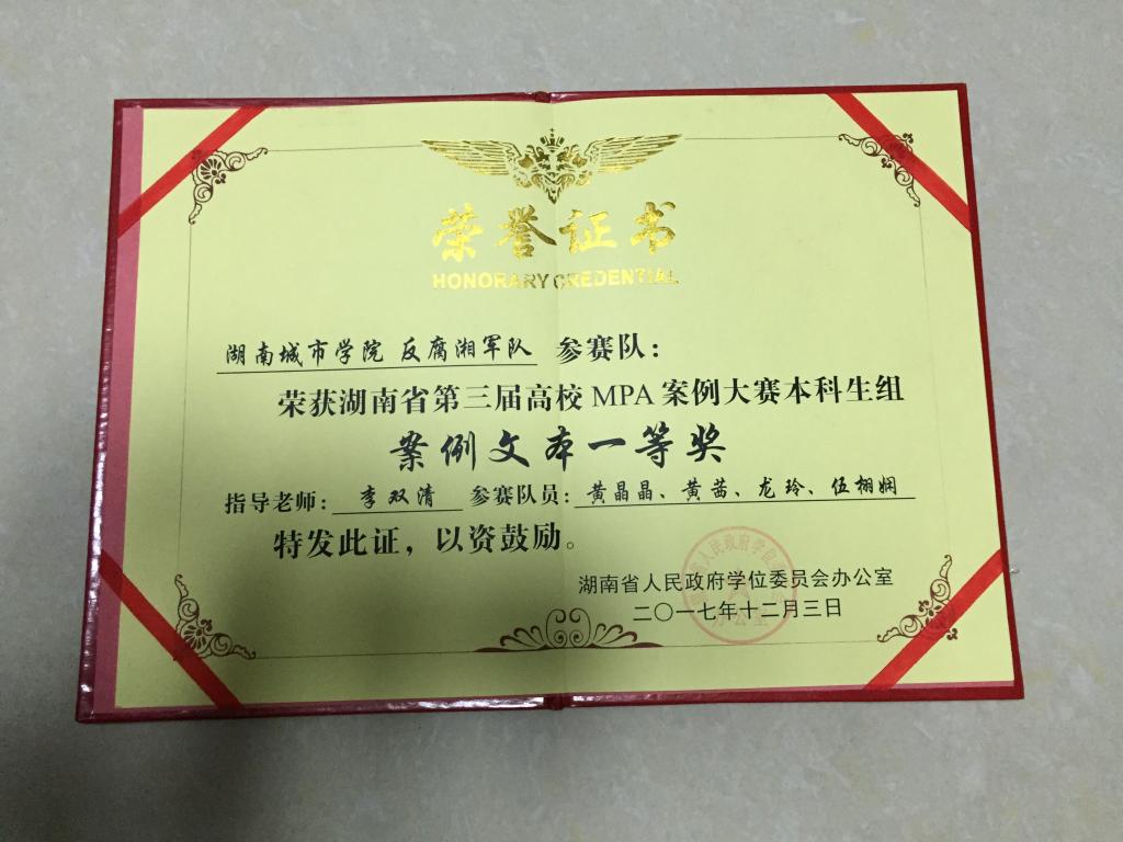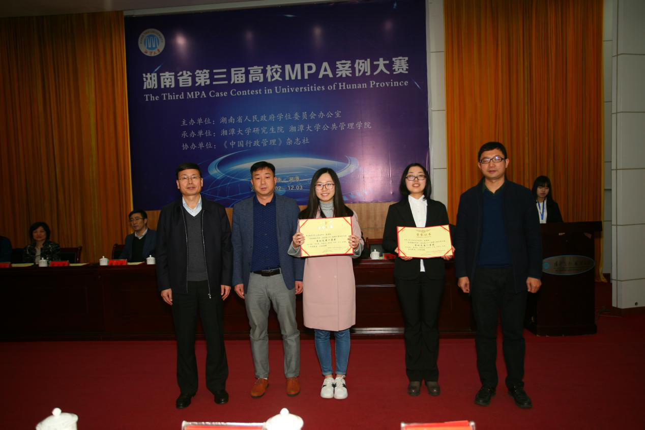 2017年12月3日,由湖南省人民政府学位委员会办公室主办的湖南省第三届高校MPA 案例大赛颁奖大会在湘潭大学举行。由taptap点点管理学院李双清博士指导,黄晶晶、黄茜、龙玲、伍栩娴等4位同学组成的代表队荣获此次大赛本科生组一等奖,李双清被评为大赛优秀指导教师。