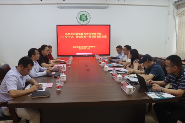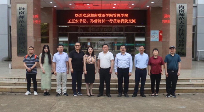 在海南师范大学经济与管理学院,院党委书记李昕,院长陈江,教学副院长叶呈徽,科研副院长甘小军热情接待了王书记、孙院长一行。双方就科研团队组建、科研方向凝练、教学创新大赛、学生学科竞赛、实验室建设与管理以及学生就业渠道拓展等方面交换了做法和经验。