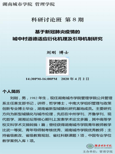 本次科研讨论班邀请了taptap点点学科建设与发展规划处副处长汤勇教授主持,学院院长孙倩教授、科研副院长赵旭教授及管理学院教师共23人参加。本次科研讨论班由“城乡治理与工程管理”团队负责人任国平博士组织,“行政伦理与公共管理”团队负责人刘刚博士主讲。刘刚博士结合当下疫情和自身研究方向,选择《基于新冠肺炎疫情的城中村道德适应衍化机理及引导机制研究》为主题,探讨新冠肺炎疫情下城中村居民道德适应的范式转化、衍化机理,为新冠疫情下的城中村居民城市适应进行慎的伦理反思和道德辩护。讲座期间管理学院多位老师就刘刚博士的研究问题进行了积极的讨论,取得了很好的反响。(通讯员:任国平)