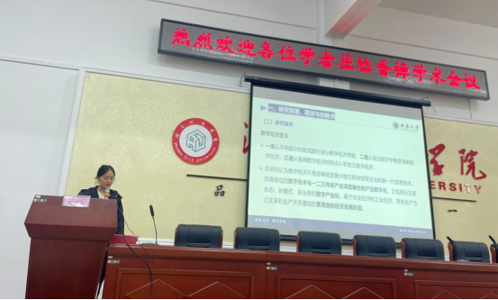 第二位汇报人是来自西南大学的杨玉琪。汇报的题目是《数字经济驱动城市经济高质量发展的机理与效应评价》。报告构建了“数字经济部门-传统经济部门”两部门模型,并据此分析了数字经济驱动城市经济高质量发展的作用机理,在此基础上测度了我国 279个地级市 2011-2020年数字经济发展水平,对数字经济的驱动效应进行了评价。研究发现:(1)数字经济发展水平不断提升,但区域间发展表现出明显的异质性。(2)数字经济显著促进了城市经济高质量发展,且数字要素的投入、产出与转换效率的提升均对经济高质量发展存在显著的驱动作用;异质性分析发现,数字经济对开放发展的促进作用最强,同时东部地区的驱动效应最大;城市经济高质量发展具有时间连续性,且数字经济在一定时间内对经济高质量发展具有叠加促进作用。(3)目前数字经济对经济高质量发展的驱动作用更多的通过使生产更加靠近生产可能性曲线来实现,其通过外扩生产可能性曲线进而提高经济发展质量还任重道远。