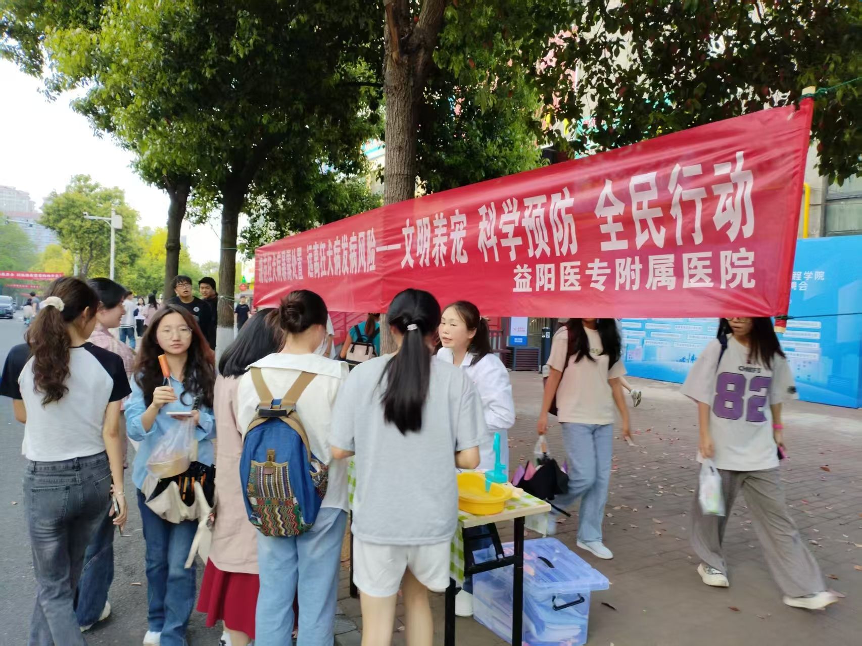 在现场宣传展台前,前来咨询的师生络绎不绝。益阳医专附属医院急诊科专家认真解答了从文明养宠、科学预防到急救处理、接种狂犬病疫苗等各方面的疑惑,以专业、细致、敬业的医者情怀赢得了众多师生的点赞。