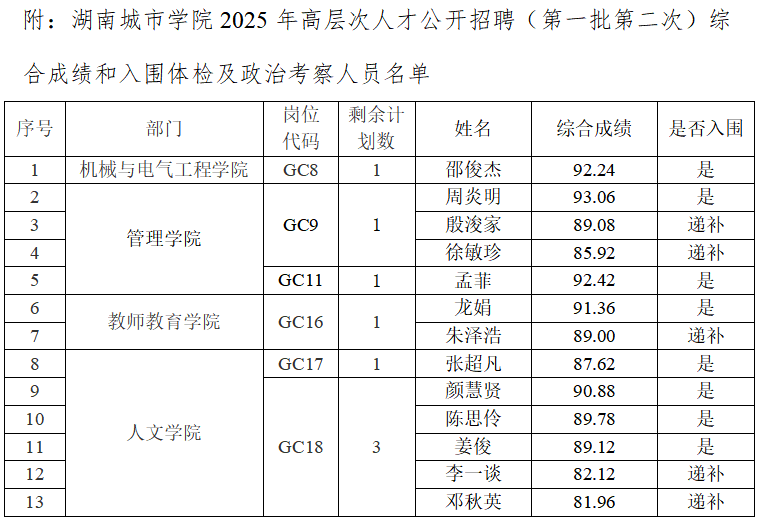 有体检或考察不合格者或放弃资格者,按应聘同一岗位综合成绩排名先后依次等额递补2次。