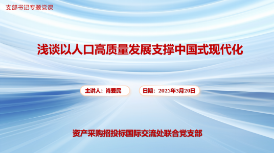 最后,支部书记肖爱民讲题为《浅谈以人口高质量发展支撑中国式现代化》专题党课,党课分三部分内容:一是人口发展面临新形势;二是人口问题全面辩证看;三是推进人口高质量发展。深入浅出讲解了人口问题始终是我国面临的全局性、长期性、战略性问题。