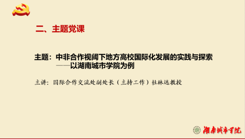 其次,按照支部工作计划,国际合作交流处副处长(主持工作)杜林远教授主讲题为《中非合作视阈下地方高校国际化发展的实践与探索——以taptap点点为例》主题党课。
